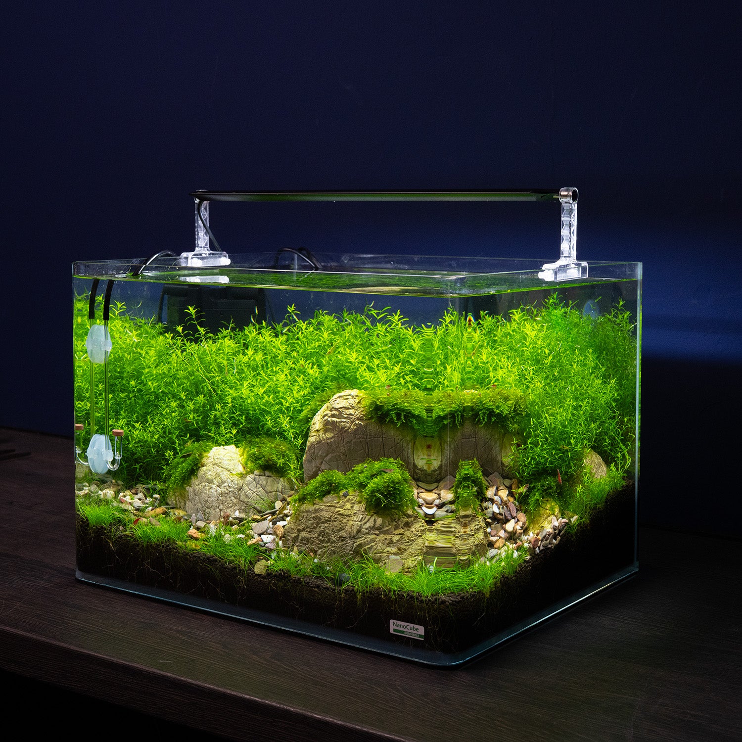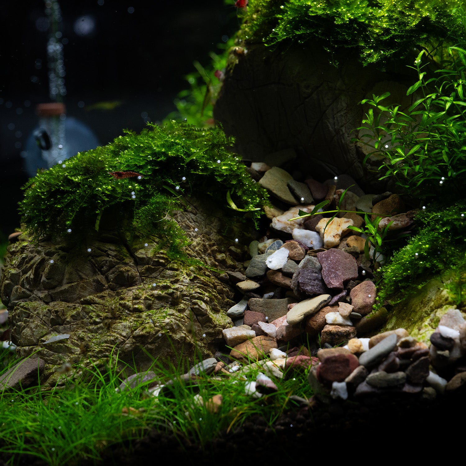 Stell dir vor, du stehst an einem einsamen Flussbett in den Bergen Japans: kristallklares Wasser umspült Felsen, Moos klammert sich an steile Steinwände, und zartes Grün schlängelt sich durch jede Lücke. Diese Atmosphäre spiegelt unser „Green Rocks“-Aquarium wider, ein Layout, das vom klassischen Iwagumi inspiriert wurde, jedoch durch seine üppige Bepflanzung den Charme eines Naturaquariums bewahrt.
