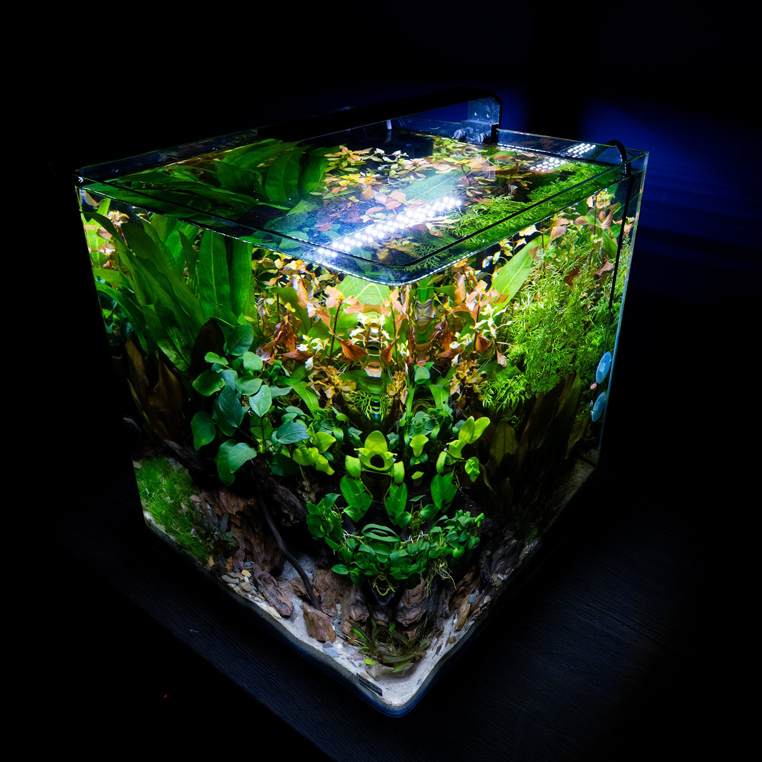 Imagine entering a scene straight out of a sci-fi adventure: seemingly weightless rocks float above the substrate, green plants cling to their rough surfaces—and in the midst of it all, bright orange guppies silently circle like birds between floating islands. Our 60-liter Nano Cube, "The Floating Stones," brings this surreal image to life.