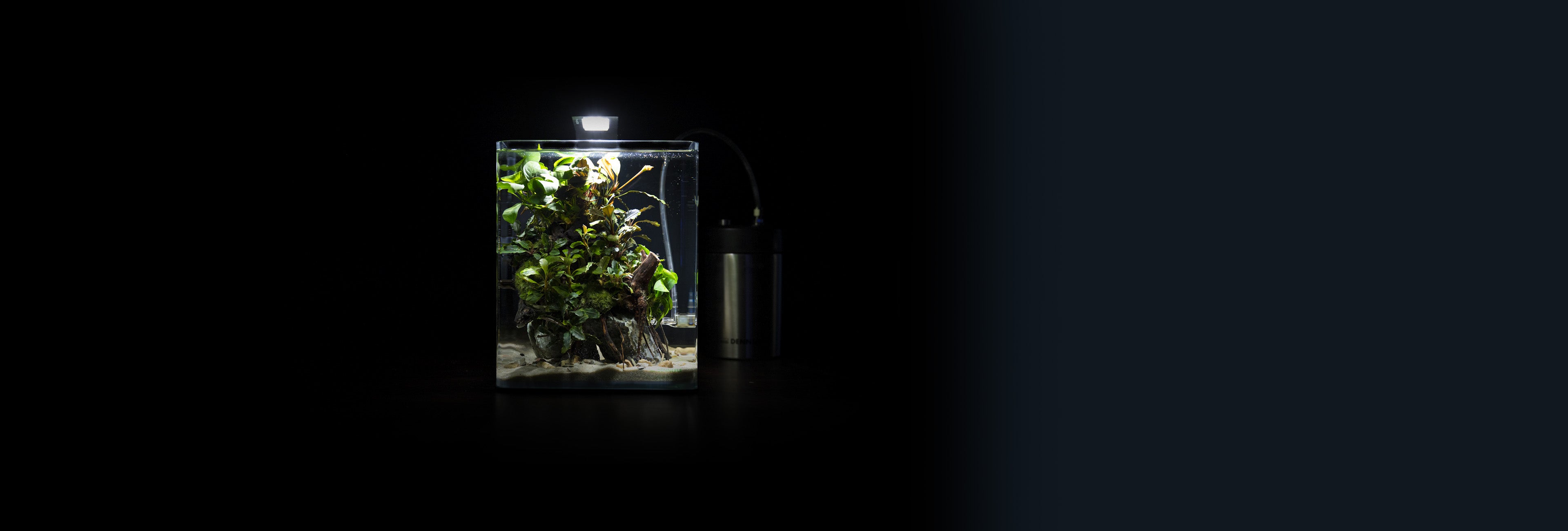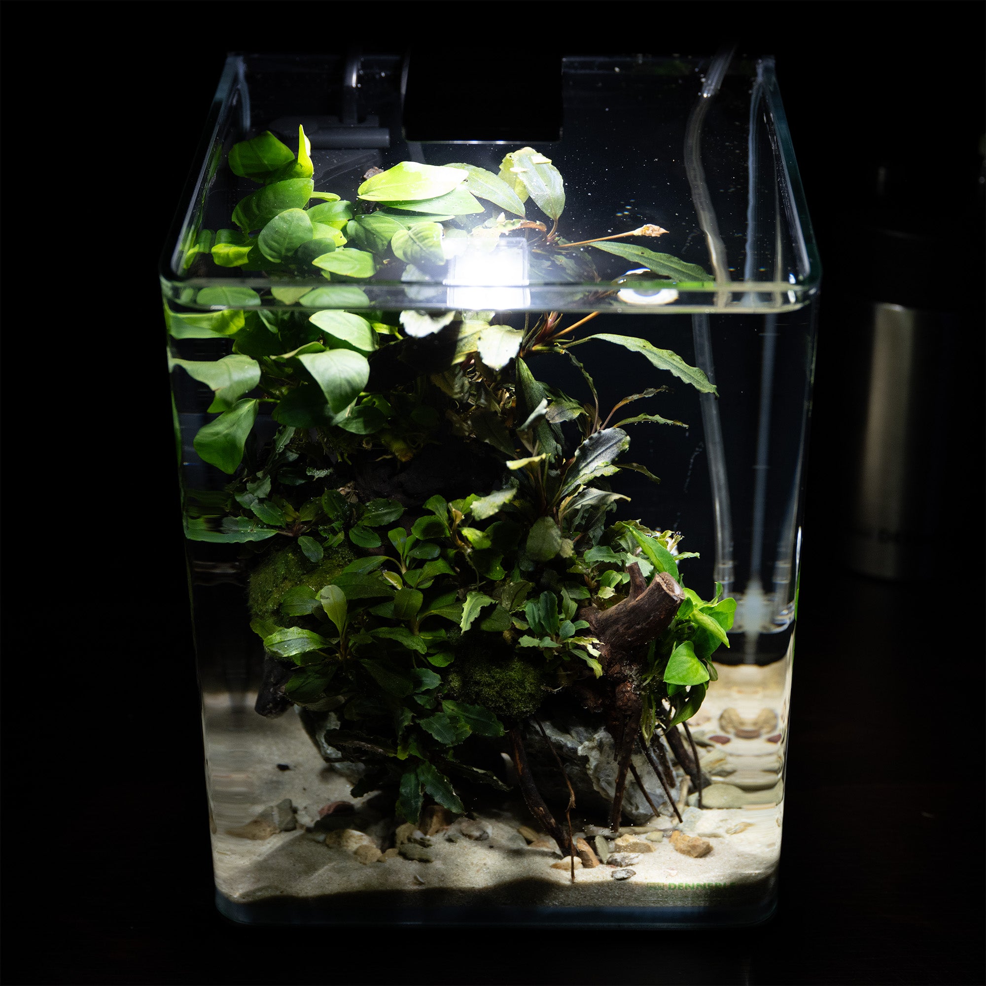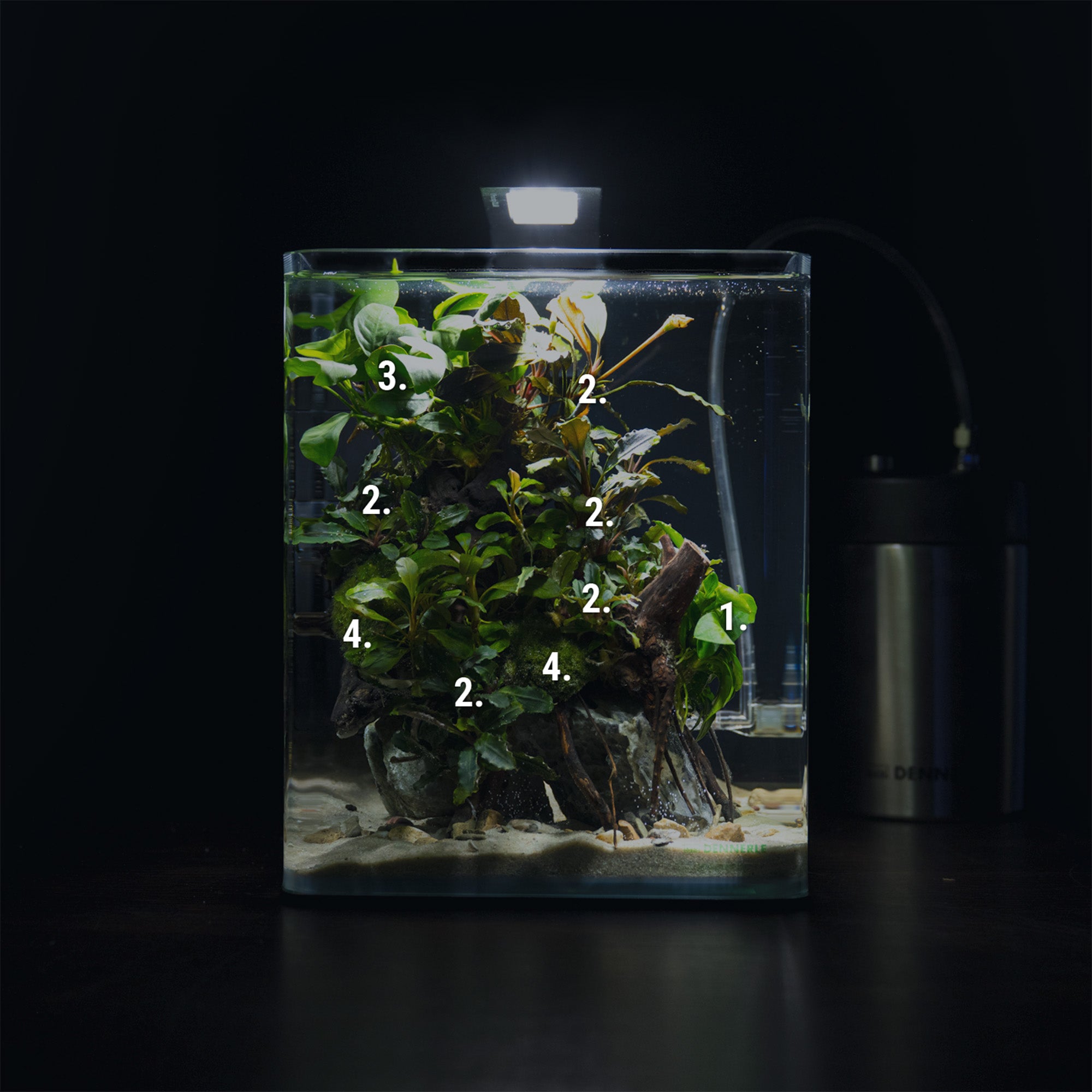 Malgré sa taille minuscule, le bac offre une réelle impression de profondeur : à l’avant, une bande de sable dégagée ouvre la perspective, tandis que la colonne forme le cœur marquant de la composition et dissimule habilement toute la technique. Ce « Nano Jungle » associe la structure épurée d’un décor Iwagumi à l’effet luxuriant et sauvage des plantes épiphytes – idéal pour tous ceux qui disposent de peu d’espace mais veulent beaucoup d’ambiance jungle.