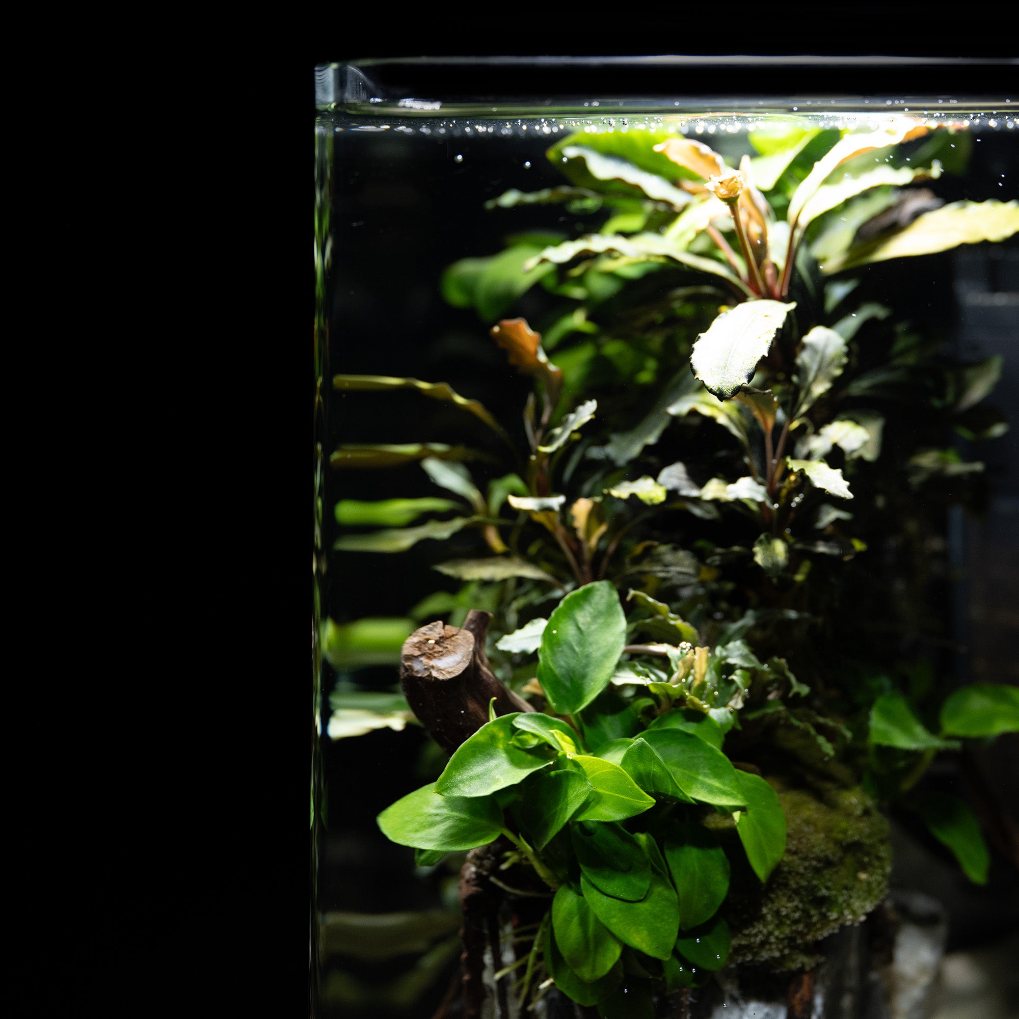 Imagine que tu écartes doucement de denses lianes et que tu pénètres dans une clairière cachée, en plein cœur de la forêt tropicale – sauf que cette jungle n’est pas plus grande qu’un livre. Dans notre Nano Cube de 10 litres, se dresse une unique colonne rocheuse recouverte de plantes, semblable à l’arche fissurée d’un ancien temple. Sur ses flancs s’accrochent de petites Anubias, tandis que de fines racines pendent vers l’eau cristalline.